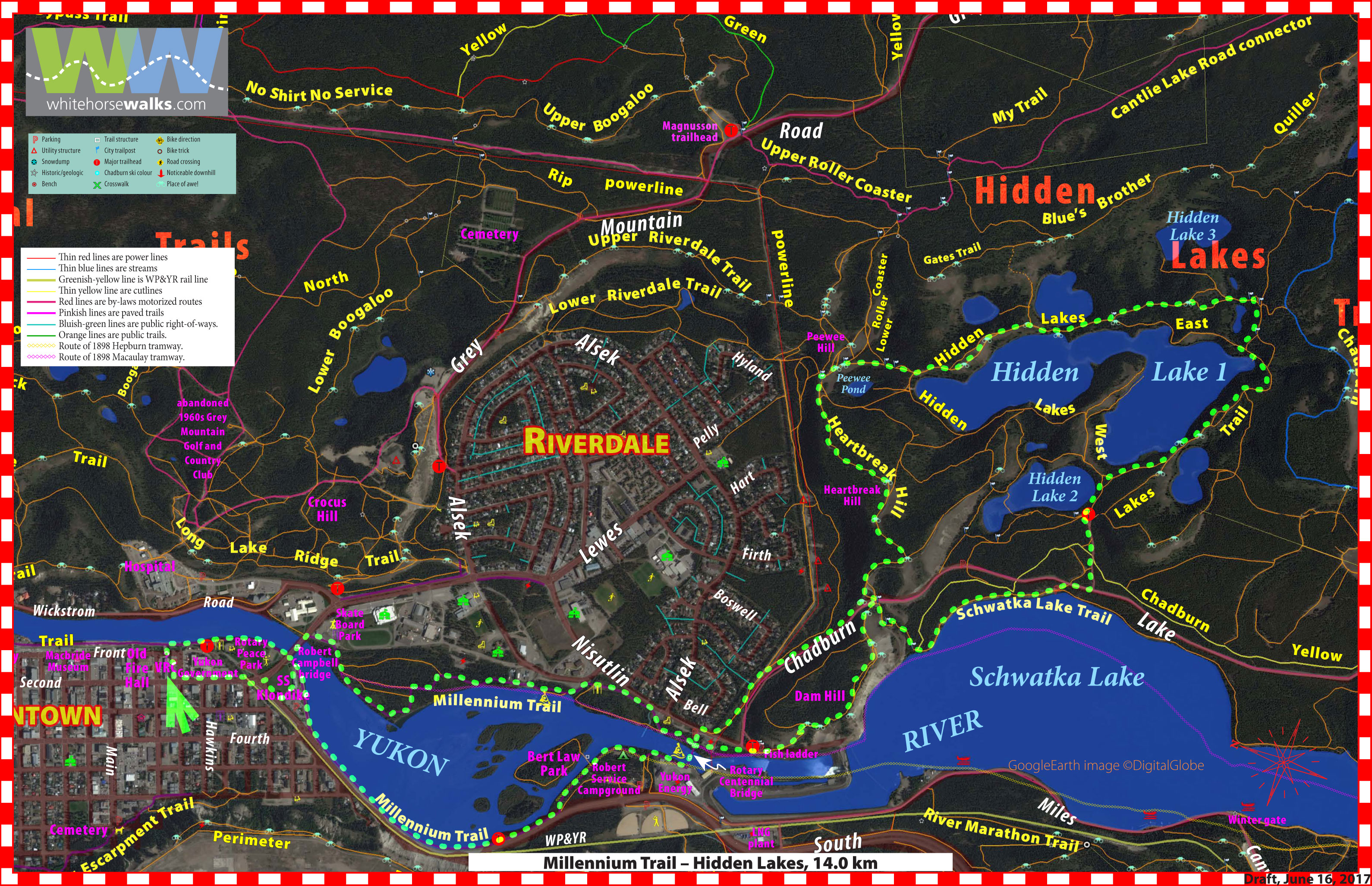 Whitehorse's version of an urban hike: waterfront, industrial, residential, airport escarpment, ball diamonds, campground, Rotary Centennial Bridge and Millennium Trail. You can visit Main Street attractions, our library, the new Kwanlin Dün Cultural Centre, Shipyards Park, community gardens, take in some of the lower escarpment parks, our very own Stairmaster and get great views over Downtown and the river valley. You can stop and see the Fish Ladder and the S.S. Klondike National Historic site, the Territorial Government building and Rotary Centennial Park.